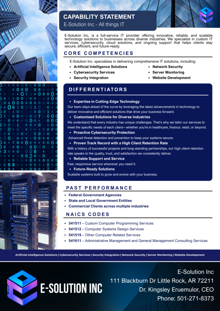 An informative page sharing the mission, vision, and values of E-Solution Inc. Highlight the expertise of the team, innovation-driven processes, and commitment to delivering robust AI and security solutions.